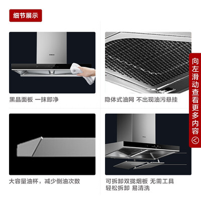 拥有澎湃风量,搭配双拢烟板,快速排烟效果更佳。采用挥手控制感应,可自动调节,面板不会沾染油污,使用舒心。