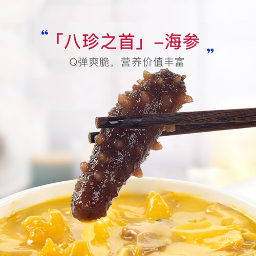 甄选五种自然食材制作浓汤,经24小时文火慢熬,造就鲜香浓郁的地道金汤。加入鲍鱼、海参、花胶三种优质食材,真材实料,吃着更满足。