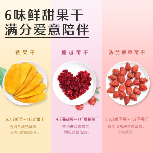 严选国内外的优质水果作为原料,食材新鲜饱满且水润多汁。经过浸糖、慢烘焙等工艺,果干或软嫩或嚼劲十足。