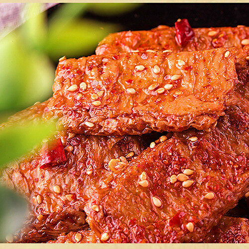 精选优质大豆精制而成,质地细腻且布满油花,可谓色香味俱全,令人垂涎。咬一口,可见丝丝纤维,鲜嫩爽口,麻辣的口感很有嚼劲。