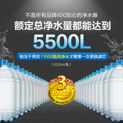 采用专利MAX3.0长效反渗透滤芯,病毒去除率高达99.999%,给予家人健康呵护。大水量设计,轻松应对全家的饮水需求。