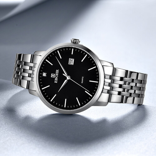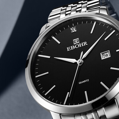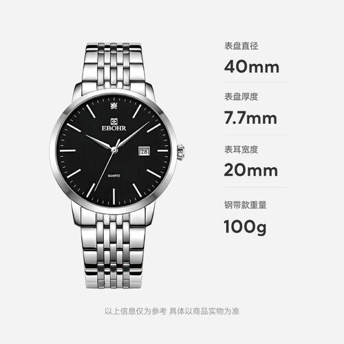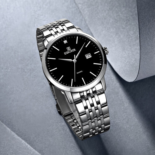 黑色表盘搭配不锈钢表带和表壳,简约大气,无论搭配休闲装还是正装,都让你散发出成熟魅力。不锈钢双按扣,让摘戴更便捷。