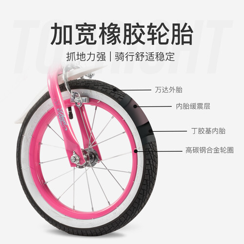配有安全辅助轮,形成三角结构,更能有效的防止侧摔情况。采用台湾KMC链条,无声骑行并不易断链。