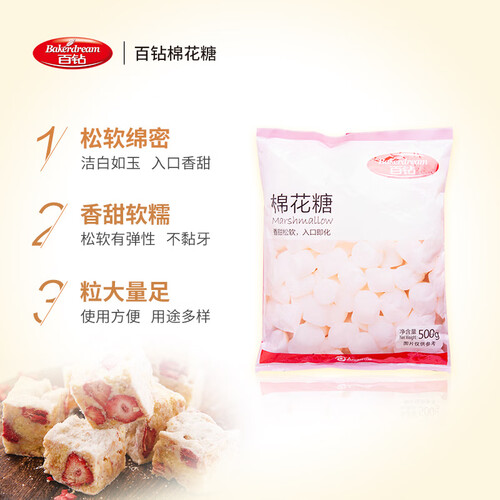 棉花糖可以放入咖啡或牛奶中当做饮品饮用,口感浓郁顺滑,口味甜而不腻。同时可以加热放入其他材料制作牛轧糖,不粘牙。