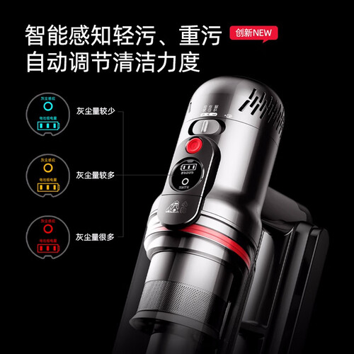 这是一款吸拖一体的无线手持吸尘器,可以进行智能的灰尘感应,从而让清洁更高效,且水箱内可搭配消毒液,能更好地净化家居环境。