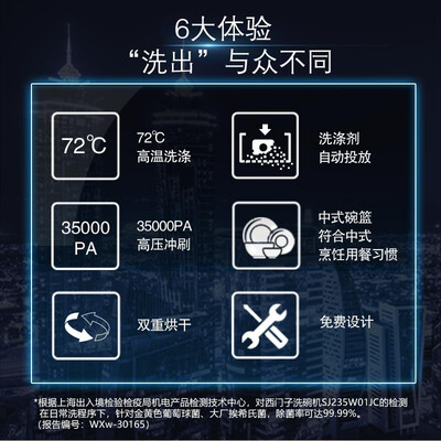 利用72℃水流冲刷餐具,有效除菌守护家人健康。加上35000PA高压冲刷,无惧重油污。还有双重烘干功能,避免滋生细菌。
