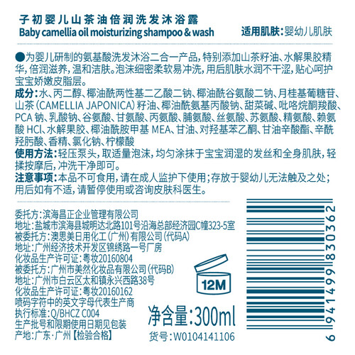 添加有机山茶油精华,富含维生素E,具有良好的润肤效果。采用无泪配方,不会刺激孩子眼睛,能够带给宝宝舒适的洗澡体验。