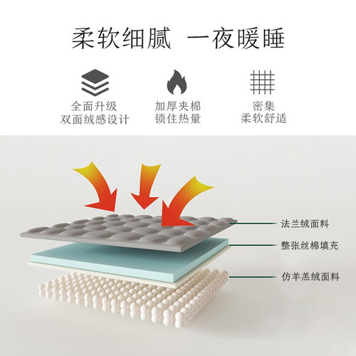 采用法兰绒和羊羔绒材质,质感细腻厚实,触感舒适温暖,耐用不易掉毛。环保印染工艺,色泽清新明亮,健康不褪色。