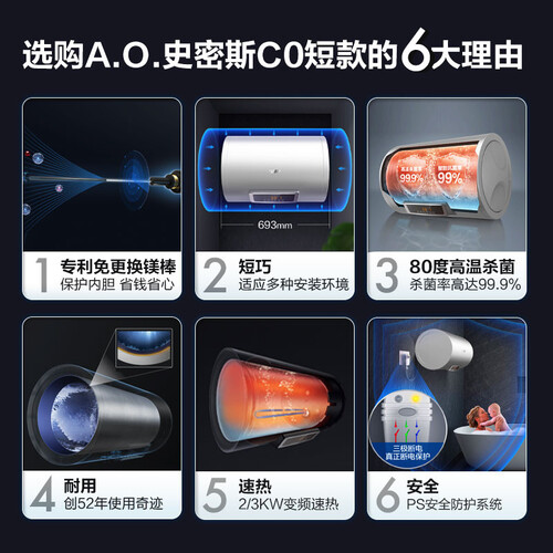 采用3000W变频速热大功率,结合双重抑菌保护,大幅提升热效率的同时呵护沐浴健康。专利免更换镁棒,耐用又省心。