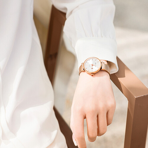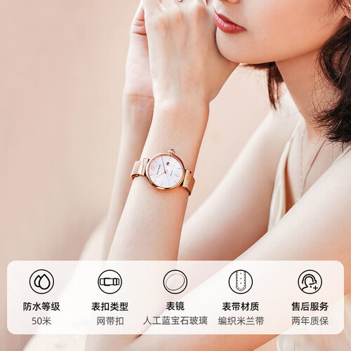 时髦的米兰表带彰显你前卫的穿搭品味,款式经典耐看不易过时,蓝宝石玻璃镜面更耐磨。表耳上镶嵌有透亮闪钻,为你增添魅力。