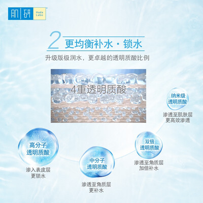 4重透明质酸,科学比例,大小不同分子渗透不同层次,由里到外补水润泽;能有效提升后续护肤品的吸收,养出细腻嫩滑肌肤。