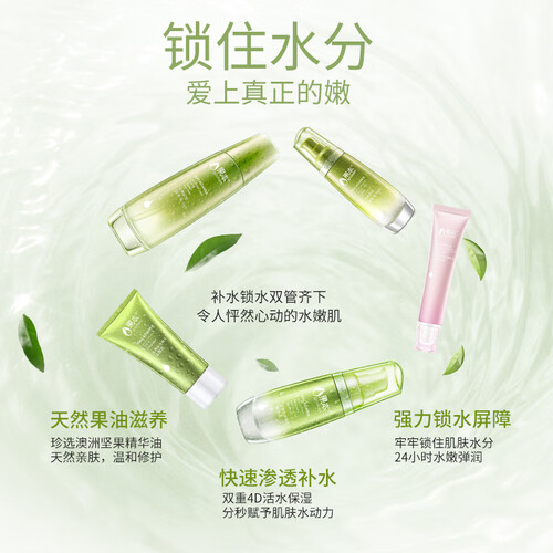 甄选澳洲坚果精华油,天然亲肤,温和修护,葡萄籽油加乘,保持肌肤原有弹力和张力;牢牢锁住肌肤水分,24小时肌肤水嫩弹润。