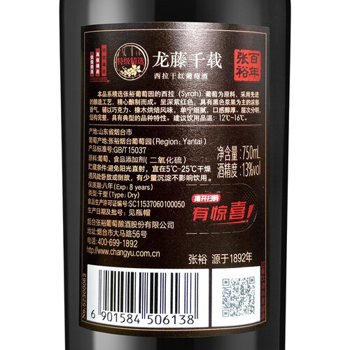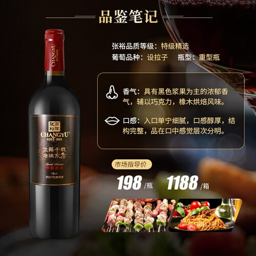 原料为张裕葡萄园的西拉葡萄,结合先进的酿酒技艺,带来平衡顺滑的口感。处理阶段减少人工干预,保留了葡萄自然的香气。
