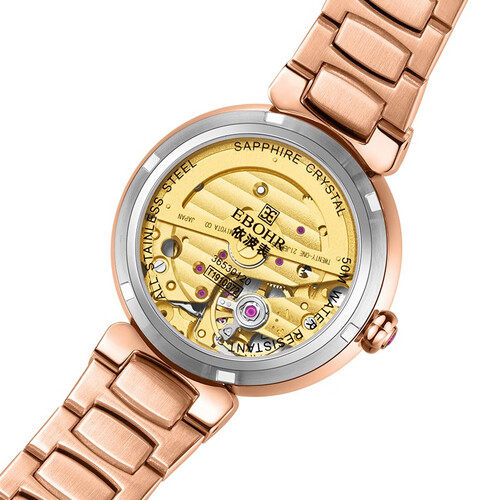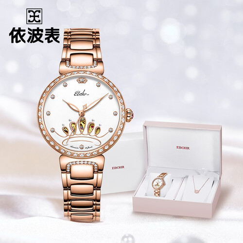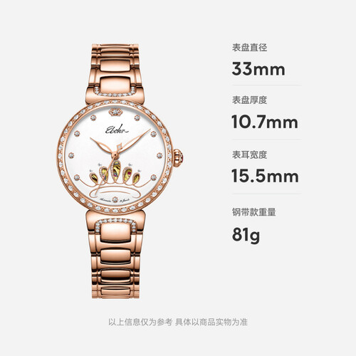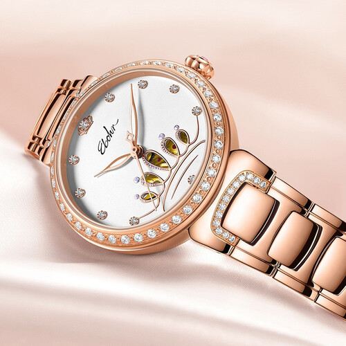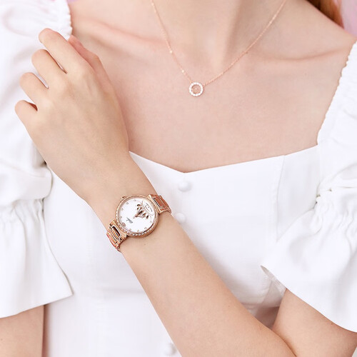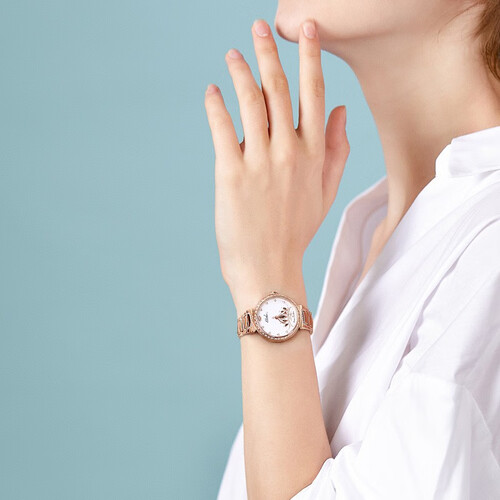 皇冠镂空造型的表盘,玫瑰金色金属,带来轻奢质感,外表多颗锆石装饰,让整个表盘看起来绚丽多彩,带给你轻奢时尚。