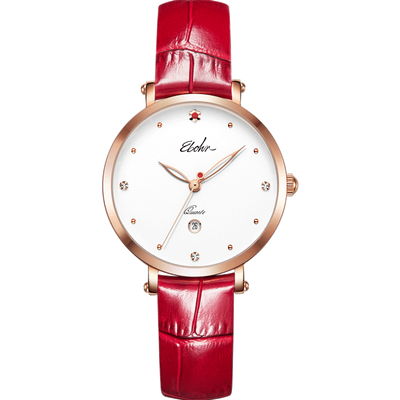 金属字钉搭配12点花形时标,不仅仅丰富造型感,同时闪烁着迷人光泽。质感红色的表带,搭配各种肤色都能轻松显白。