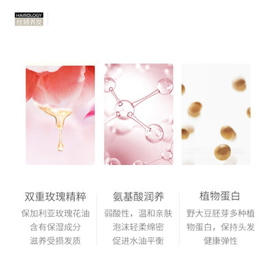 优选玫瑰花油和水解小麦蛋白,润养干枯受损发丝,滋养头皮,锁水保湿。0硅油配方,不增加头皮残留,减少掉发的现象。