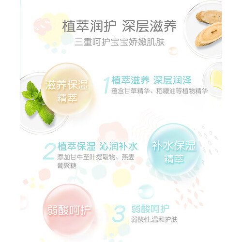 采用弱酸性配方,贴心呵护宝宝敏感肌肤;甄选植物精萃,达到肌肤深层保湿修护,告别肌肤干燥起皮现象。