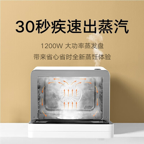 可30秒快速出蒸汽,加一次水最多可以蒸120分钟,能蒸会烤,拥有多种烹饪模式,配备了智能食谱,想做什么都可以一键烹饪。