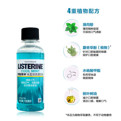 添加植物精华,口感香甜。不含酒精,入口不刺激,使用更安心。蕴含薄荷醇精粹,可以保持口气持久清新,告别口臭。