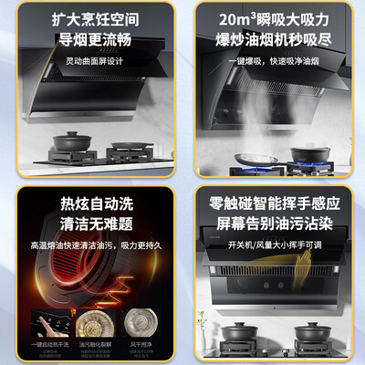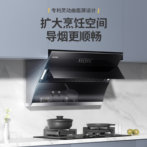 采用灵动曲屏式设计,线条流畅,造型美观现代,提升厨房家装格调。一键爆吸设置,提供瞬时大吸力,轻松应对爆炒时刻。