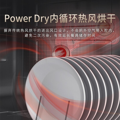 自带强力烘干功能,洗完后的锅具和碗筷后能快速烘干,避免滋生细菌。半嵌入橱柜的设计,厨房会更显整洁干净。