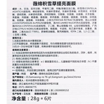 采用天然植物纤维面膜纸,更好的贴合面部,易于精华吸收。含有积雪草提取物,让肌肤细腻有光泽,长效使用有效强韧肤质。