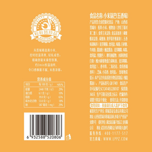 优选晋城饱满的黄小米为原料,经过3分钟恒温油炸后快速离心脱油,所制锅巴色泽金黄,散发着浓浓的米香味,入口酥脆不油腻。