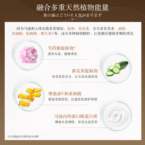 来自北海道的马油成分,具有亲肤渗透性,能快速渗透头皮,修护受损发根,从而焕发秀发的弹性和活力,开启顺滑体验。