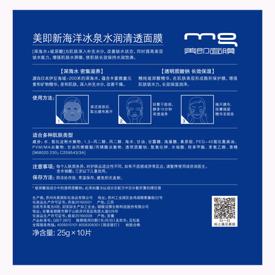 玻尿酸加深海水,能够使肌肤润泽,深层补水,并能锁住水分。配合高能膜布,通过立体裁剪,更能贴合脸部,无死角般呵护肌肤。
