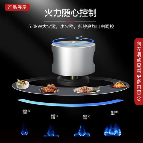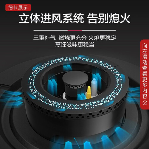 采用5.0kw大火力技术,外圈焰叠焰助力,锅底受热更全面,内圈焰聚焦火力,由中心四向均匀扩散。立体进风系统,告别熄火。