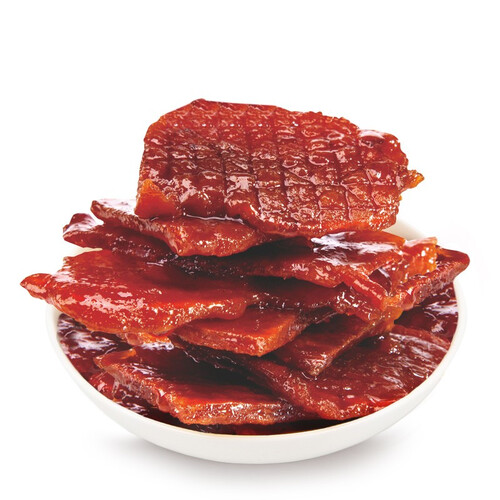 360度的滚揉翻炒入味,确保肉脯的滋味更加充足。同时原切大片的猪后腿肉,更是十分咸香有嚼劲。