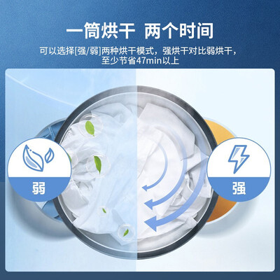 大容量内桶,可容纳床单被单等大体积衣物,换洗不再受天气限制。拥有快速烘干模式,可选择强弱两种烘干程度,省时省心。