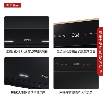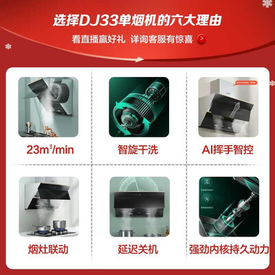 AI挥手智控功能,抬手就能调换风量,无需感应开关机。23立方大吸力,能快速的吸走油烟。智旋干洗,全进风聚能环设计。