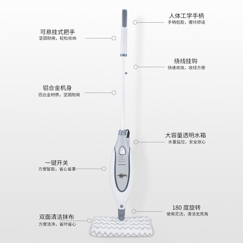 180度旋转拖把头,使用灵活,绕线挂钩,方便收纳。不用添加任何化学剂,利用120度高温即可为整屋地面除菌,不用担心污染。