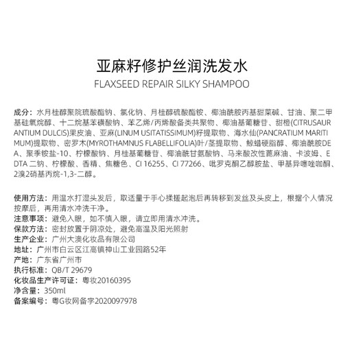 修复烫染后的化学损伤,特别添加亚麻籽修护成分,温和控油净屑,清洁化学残留物质,护理毛囊,洗出清爽丰盈,柔顺飘逸发质。