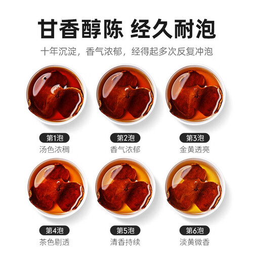 经过10年陈化的优质陈皮,具有复合型的陈化香味,醇香四溢。热水冲饮,可以看到茶色金黄通透,自然明黄,品之令人神清气爽。