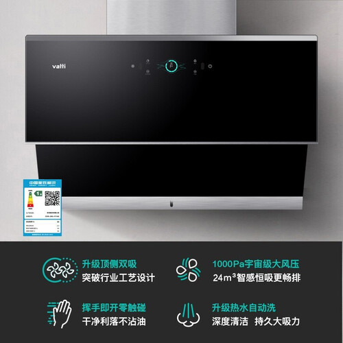 AI烟感巡航,发现烟道堵塞会自动启动强排模式,挥手智控不再担心油腻的手触控不灵敏,热水自动清洗保持机身洁净。