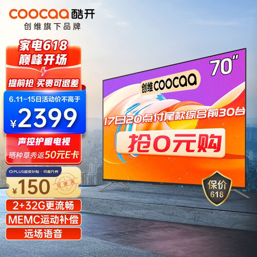 70英寸大屏电视,视野更加开阔,观看不受边框限制,享受大屏观影乐趣。光学防蓝光技术,光谱平移有害蓝光,健康呵护你的双眼。