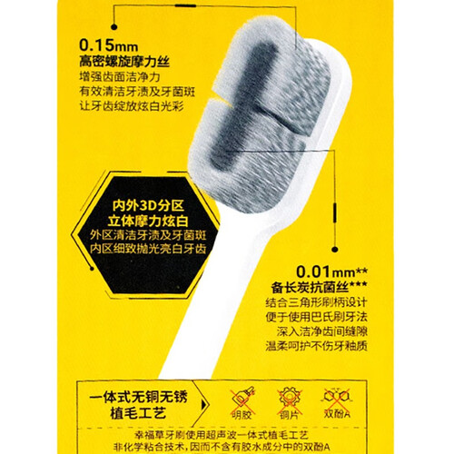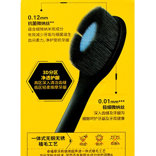 0.12mm柔韧刷丝,轻盈舒适,缓解敏感牙龈,温和不刺痛。蕴含备长炭因子,净化口腔细菌,使口气更清新。