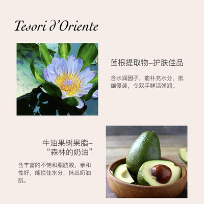 蕴含牛油果树果脂,更加亲和肌肤,让肌肤更容易吸收。具有清雅的水莲花香,香气淡雅不厚重,尽显主人不凡品味。