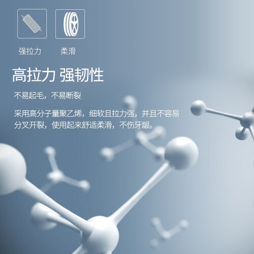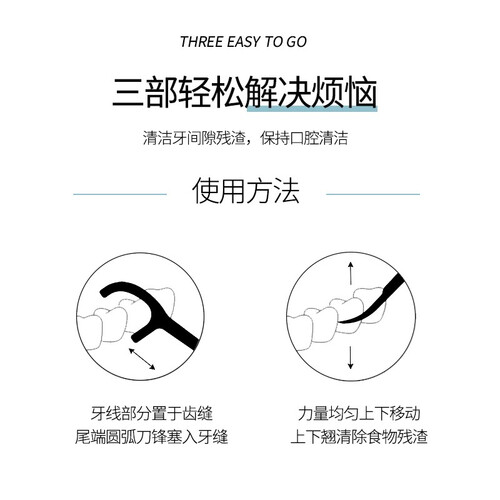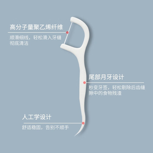选用高分子量聚乙烯打造牙线,柔软丝滑强拉力,纤细易入缝,深层净齿不扩张。月牙尾部设计,辅助清洁效果好。
