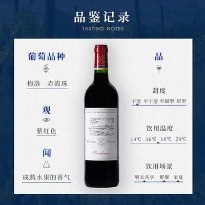 甄选优质的葡萄,经严格工艺酿制,酒体呈宝石红色,果香浓郁,令人垂涎欲滴。入口柔顺醇厚,唇齿留香。