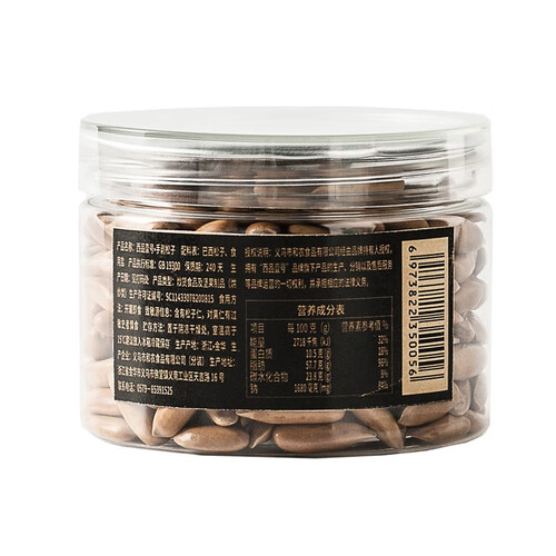 选用颗粒饱满的巴西松子,结合经典原味,更好品尝松子的香气。透明罐装设计,锁住新鲜,松子的品质一目了然。