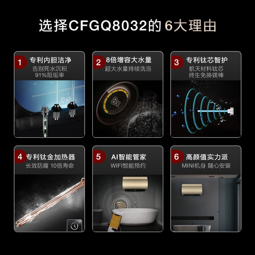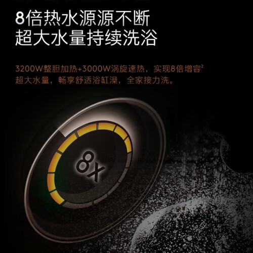 3200W整胆加热,配和8倍整容,全家沐浴不再久等。WiFi智能模块,可在手机上开关热水器,回家就能享受热水澡。