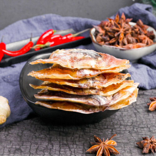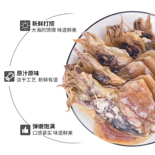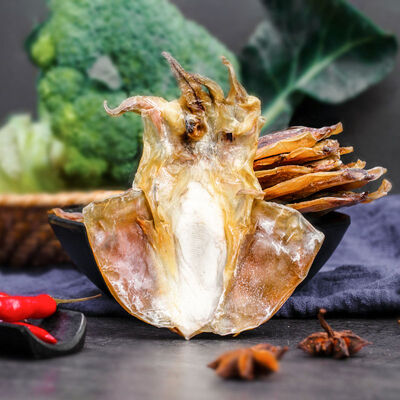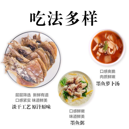 新鲜捕捞的墨鱼,经过传统淡晒工艺之后,水分尽数析出,但营养和美味都有所保留。墨鱼的肉质比较肥厚,有弹性,入口香醇。