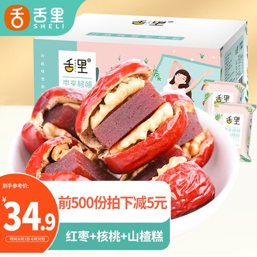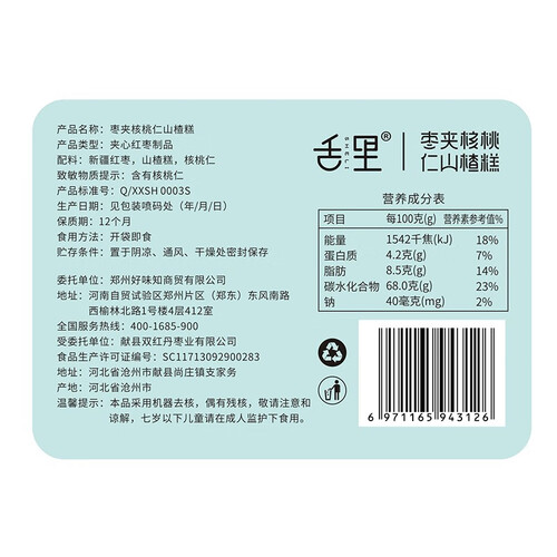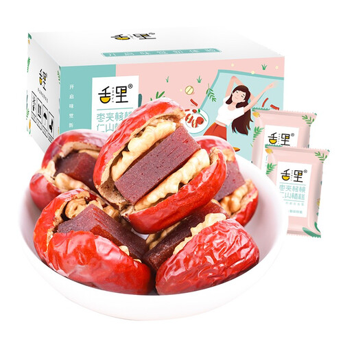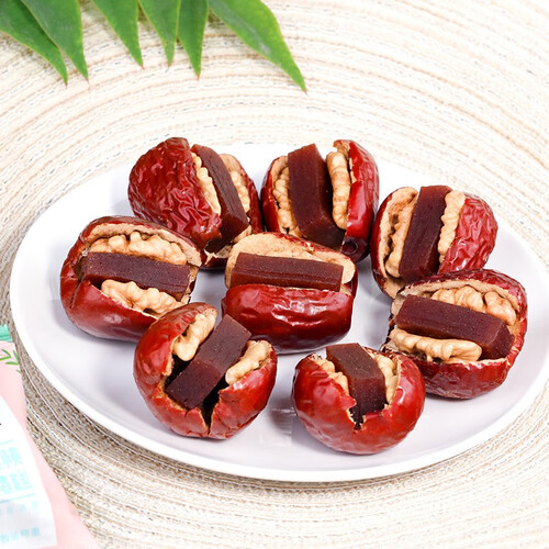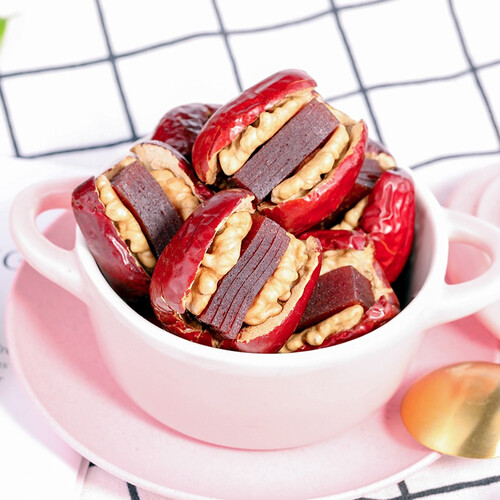 薄皮核桃仁搭配和田大枣,两者结合在一起,好吃有营养。而且还加入了山楂糕,使得口感更加酸甜。