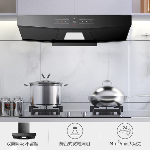 24立方米大吸力,支持中式爆炒排烟需要。自带大面积灯,实时掌握烹饪进度。挥手感应操控,使用方便,老人也能轻松使用。