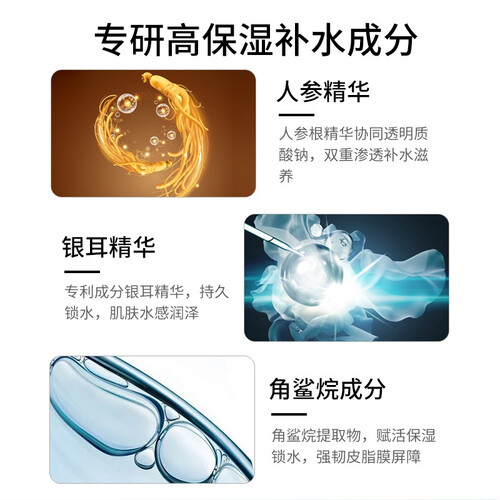经过专业测试保湿长达24h,随时都能感觉脸上水嫩嫩的,摆脱掉干燥起皮的烦恼。人参搭配银耳精华,双重补水保湿。