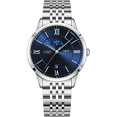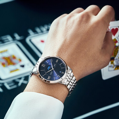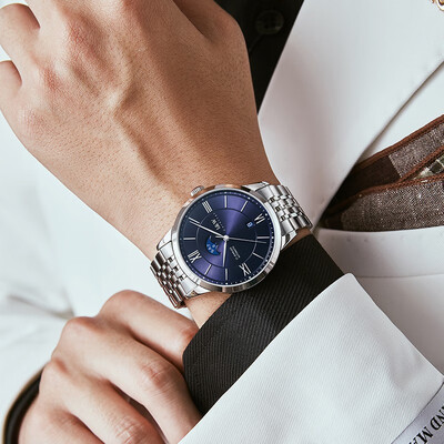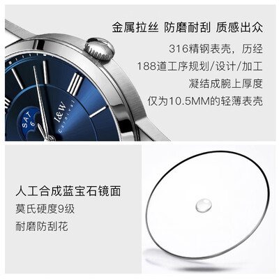 银色表圈与蓝色盘面形成鲜明的对比,层次分明显潮流。表镜甄选人工蓝宝石水晶玻璃材质打造,硬度较高,有效抗刮花。