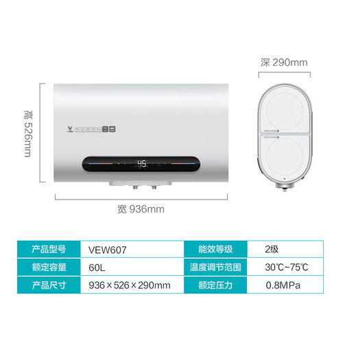 采用创新双胆设计,大大提升加热效率,机身更加轻薄。独特设计热量光带,光带颜色随热水量变化而转化,洗澡更淡定。